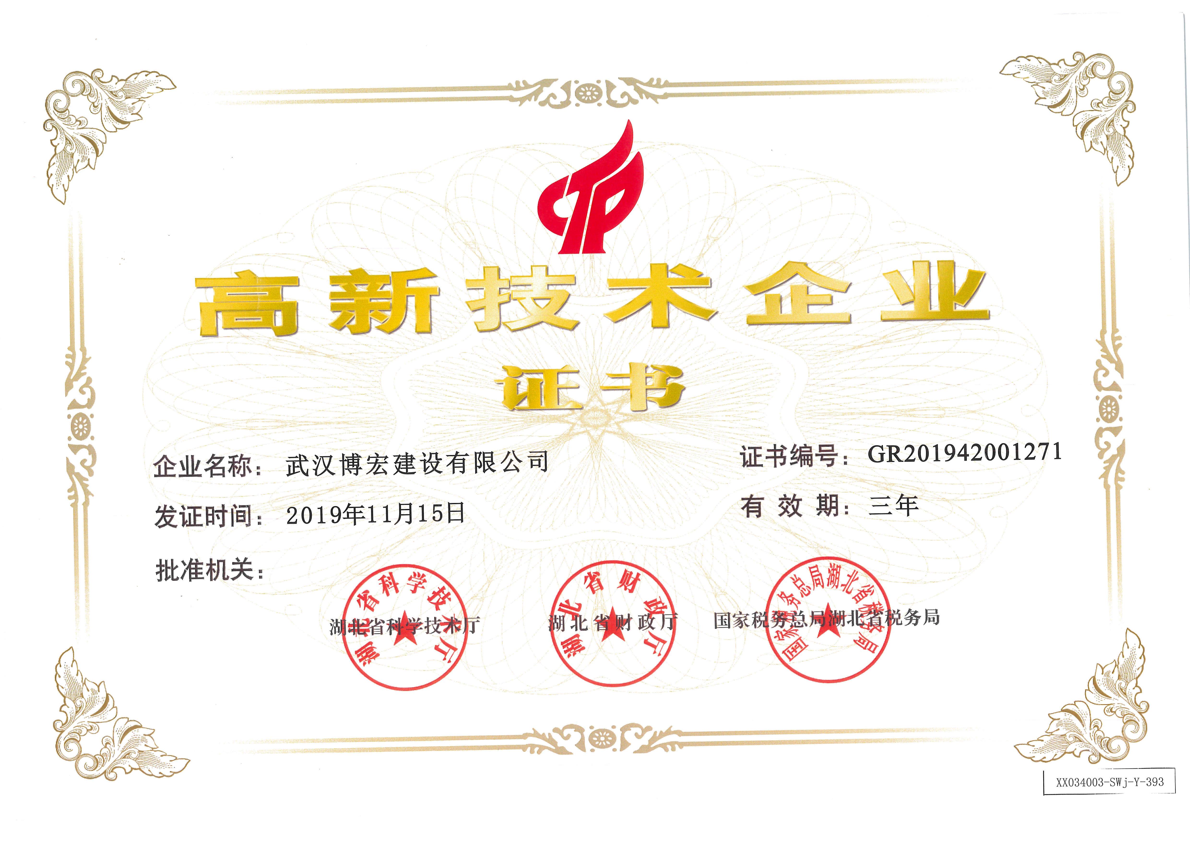 2019年11月高新技術(shù)企業(yè)證書
