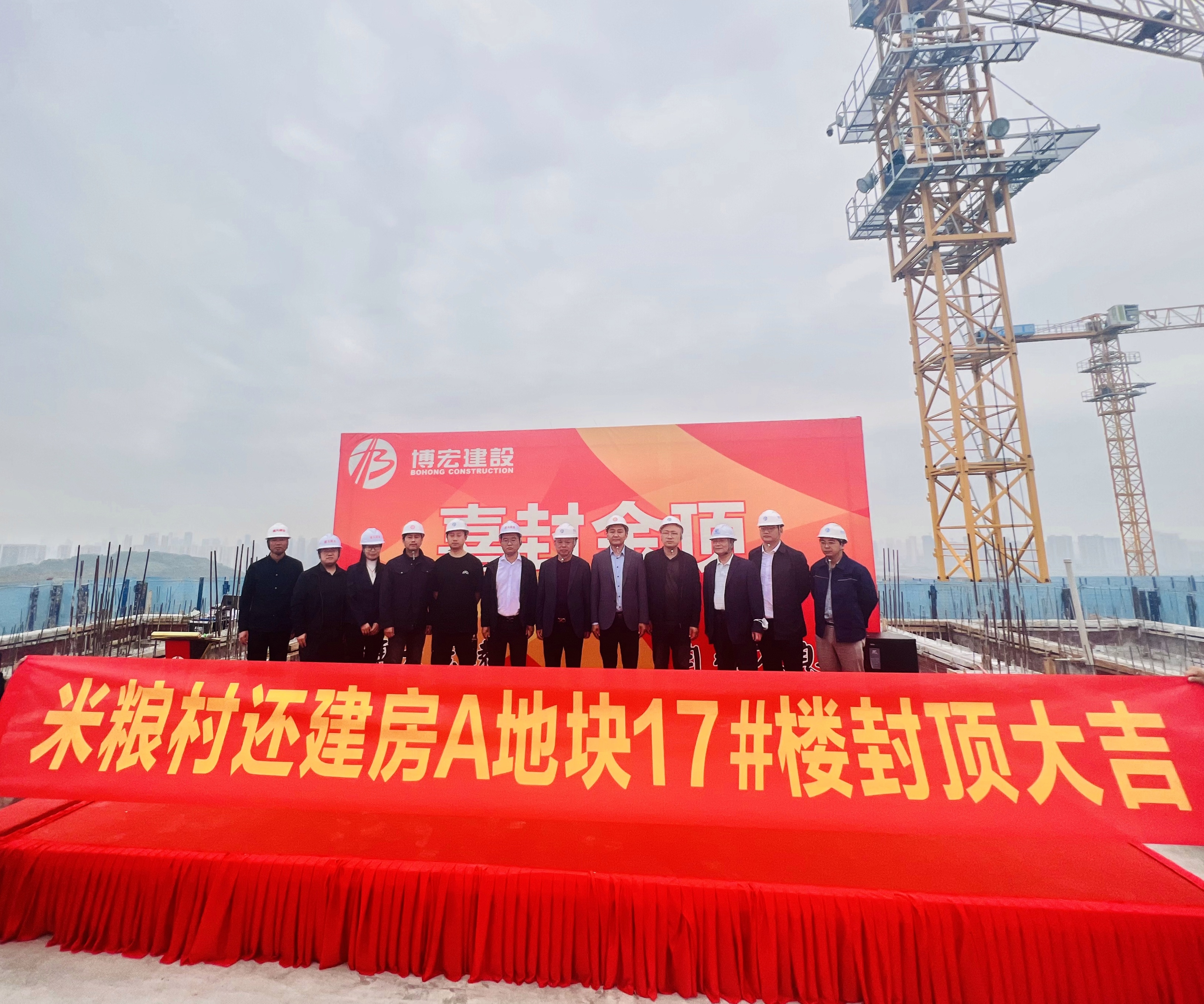 4月28日上午10時(shí),伴隨著最后一方混凝土澆筑到位,米糧村還建房A地塊17#樓主體結(jié)構(gòu)順利封頂,提前15天完成該工期目標(biāo)。博宏建設(shè)集團(tuán)常務(wù)副總經(jīng)理奚雷及各參建單位代表出席此次封頂儀式共同見證這一重要時(shí)刻。