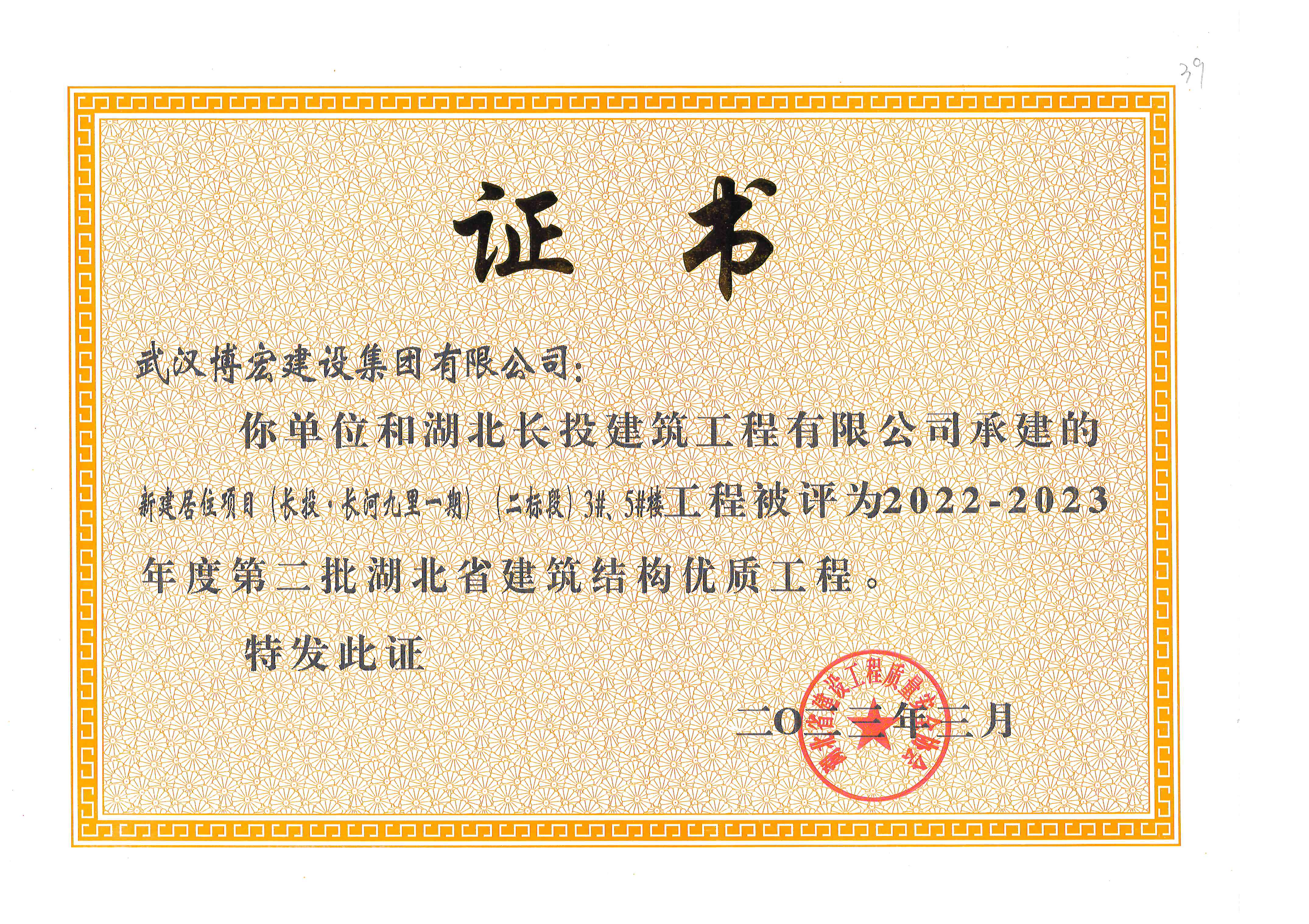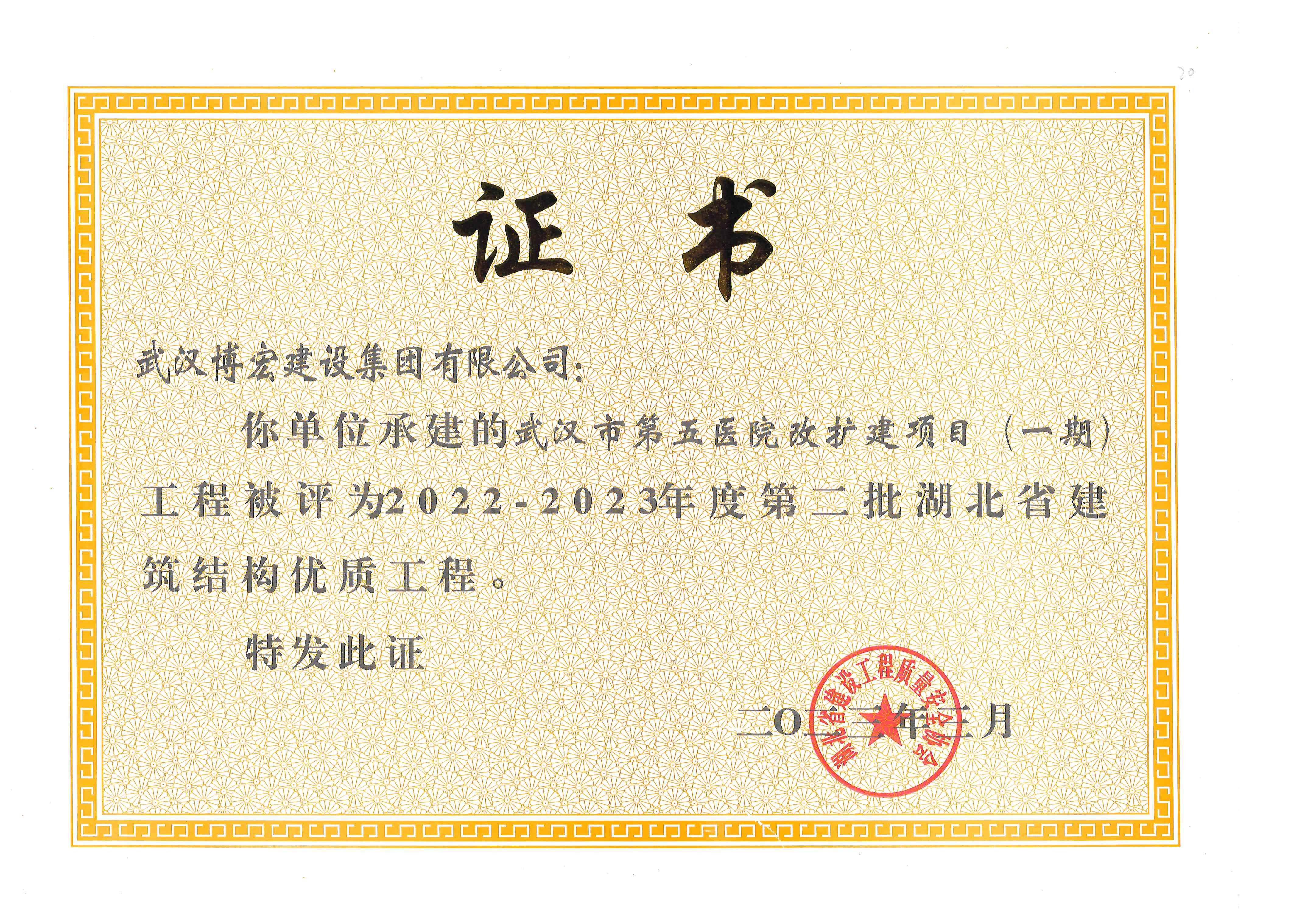 近日,湖北省住建廳2022—2023年度第二批湖北省建筑結構優(yōu)質(zhì)工程項目名單出爐,由博宏建設集團承建的武漢市第五醫(yī)院改擴建項目(一期)、新建居住項目(長投·長河九里一期)(二標段)3#、5#樓榮獲湖北省建筑結構優(yōu)質(zhì)工程獎。“湖北省建筑結構優(yōu)質(zhì)工程獎”是湖北省建筑結構工程領域的最高獎項,獲得該獎項標志著該項目在工程結構設計、工程施工管理、材料供應保證、過程質(zhì)量控制等方面均達到省級領先水平。