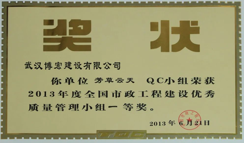 芳草云天QC小組成立于2011年5月31日,本小組從企業(yè)經(jīng)營戰(zhàn)略、方針目標(biāo)和現(xiàn)場存在的問題出發(fā),以提高效能、降低消耗、實(shí)現(xiàn)經(jīng)濟(jì)與社會效益雙贏為目的,全面優(yōu)化項(xiàng)目質(zhì)量。歷年來追求卓越、探索新品,曾獲得2013 年全國市政工程建設(shè)協(xié)會優(yōu)秀QC成果一等獎、2014年湖北省市政工程建設(shè)優(yōu)秀QC成果二等獎、2015年湖北省市政工程建設(shè)優(yōu)秀 QC成果一等獎、2022年度中國施工企業(yè)管理協(xié)會工程建設(shè)質(zhì)量管理小組活動成果二等獎、2022年中國建筑業(yè)工程建設(shè)質(zhì)量管理小組活動成果三等獎等榮譽(yù)。