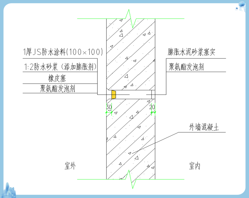 孔洞需清理并濕潤,橡皮塞需塞緊,膨脹水泥砂漿需堵塞密實,發(fā)泡膠密實度需保證,JS 防水厚度及范圍需保證。